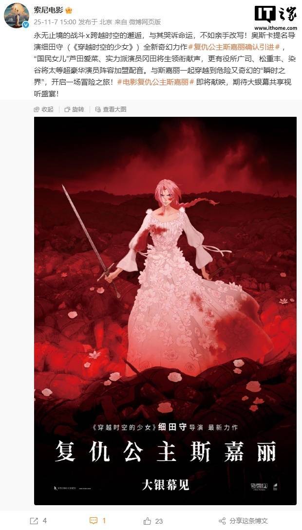 IT之家 11 月 7 日消息,索尼电影刚刚宣布,日本动画大师、奥斯卡提名导演细田守(《穿越时空的少女》)全新奇幻力作《复仇公主斯嘉丽》确认将引进中国内地,档期待定(IT之家注:日本 11 月 21 日上映)。